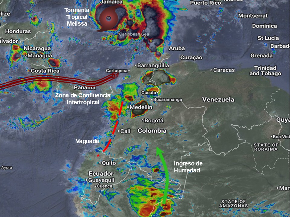 El ramal Pacífico de la Zona de Confluencia Intertropical en interacción con una Vaguada, el desarrollo de la Tormenta Tropical MELISSA al norte de la Guajira, así como procesos convectivos locales favorecen condiciones inestables, que generan lluvias ligeras a moderadas y algunas tormentas en sectores de los departamentos de la Guajira, Atlántico, Magdalena, Cesar, Sucre, Bolívar, Los Santanderes, Córdoba, Antioquia, Chocó, Eje Cafetero, Valle del Cauca, Cauca, Nariño, Boyacá, Cundinamarca, Putumayo, Caquetá, Vaupés y Amazonas. Precipitaciones ocasionales y lluvias de menor intensidad en los departamentos de Arauca, Casanare, Vichada, Mata, Guaviare y Guainía.