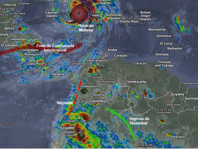 El ramal Pacífico de la Zona de Confluencia Intertropical en interacción con una Vaguada, algunos efectos generados por el Huracán MELISSA, así como procesos convectivos locales favorecen condiciones inestables, que generan lluvias ligeras a moderadas y algunas tormentas en sectores de los departamentos de la Guajira, Cesar, Magdalena, Atlántico, Bolívar, Santanderes, Boyacá, Cundinamarca, Eje Cafetero, Antioquia, Chocó, Valle del Cauca, Cauca, Nariño, Putumayo, Caquetá, Amazonas, Vaupés, Guaviare, Meta, Guainía y Vichada. Precipitaciones ocasionales y lluvias de menor intensidad en los departamentos de Sucre, Córdoba, Arauca, Casanare, Tolima y Huila.