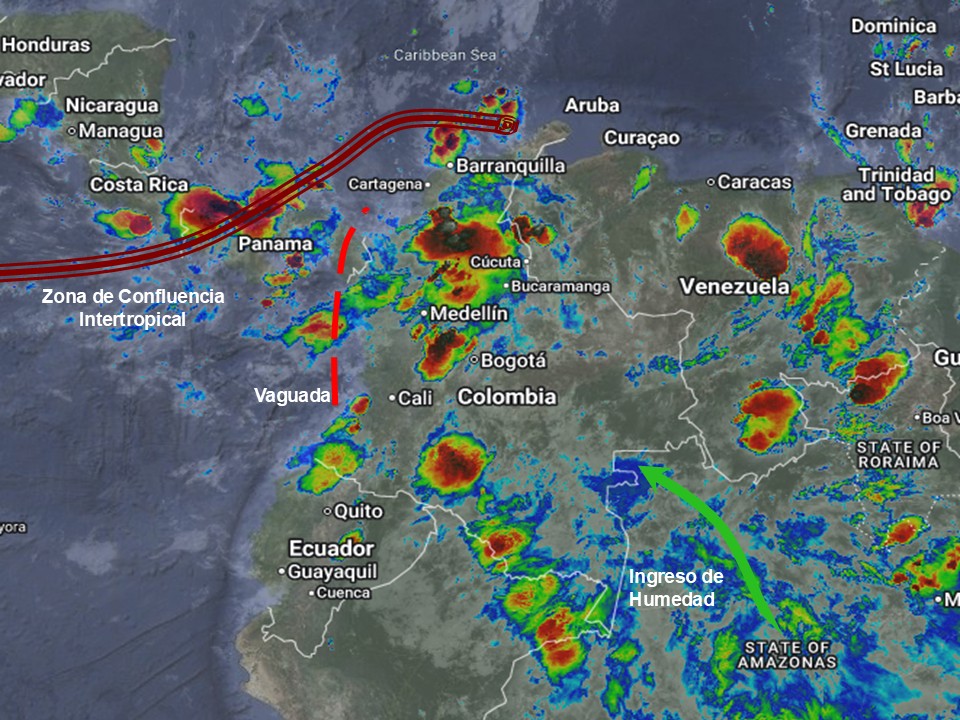 El ramal Pacífico de la Zona de Confluencia Intertropical en interacción con una Vaguada, así como procesos convectivos locales favorecen condiciones inestables, que generan lluvias ligeras a moderadas y algunas tormentas en sectores de los departamentos de la Guajira, Cesar, Magdalena, Atlántico, Bolívar, Antioquia, Chocó, Eje Cafetero, Valle del Cauca, Cauca. Nariño, Putumayo, Caquetá, Huila, Tolima, Cundinamarca, Guainía y Amazonas. Precipitaciones ocasionales y lluvias de menor intensidad en los departamentos de Sucre, Córdoba, Los Santanderes, Boyacá, Arauca, Casanare y Vichada.