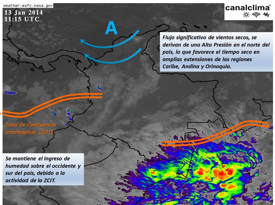 Cielo entre ligero y parcialmente nublado y predominio de tiempo seco, se prevé en amplios sectores de las regiones Caribe, Orinoquia y Andina, salvo en sectores del occidente del país (Antioquia, Chocó, Risaralda, Valle, Cauca, Nariño, Huila) y gran parte de la región Amazónica (Amazonas, Vaupés, Guainía, Caquetá y Putumayo), donde se esperan lluvias de variada intensidad, a diferentes horas del día.
