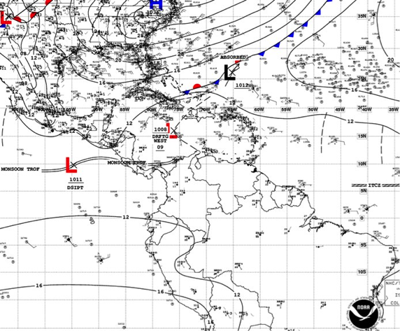 La ZCIT se encuentra a lo largo de 10N/11N entre 74W en Colombia y 86W en Costa Rica. Nubosidad y lluvias relacionadas a la ZCIT se registra en el norte del país, especialmente en la zona costera del Caribe (Magdalena, Atlántico, Sucre y Córdoba).