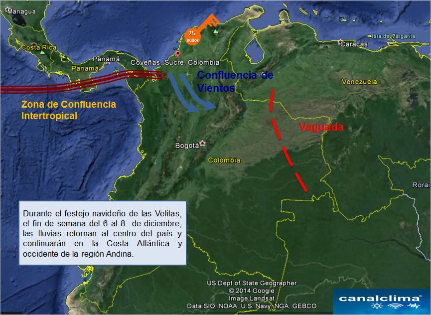 Durante el festejo navideño de las velitas, el fin de semana del 6 al 8 de diciembre, las lluvias retornan al centro del país y continuarán en la Costa Atlántica y occidente de la región Andina, debido al fortalecimiento de la Zona de Confluencia Intertropical y al ingreso de una onda atmosférica desde el Océano Pacífico que la activará temporalmente.