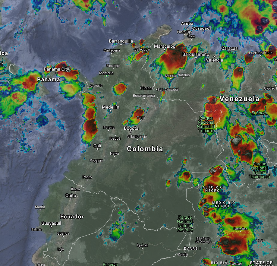 Una Vaguada en niveles bajos genera inestabilidad atmosférica a lo largo de la región pacífica, asimismo el ingreso de una Onda Tropical del Este favorece condiciones inestables en la Orinoquia y algunos sectores de la región Caribe. Lluvias de variada intensidad, algunas acompañadas de actividad eléctrica en sectores de los departamentos de Chocó, Antioquia, Risaralda, Valle del Cauca, Magdalena, Cesar, Vichada, Guainía y Vaupés. Precipitaciones de menor intensidad en Santander y Boyacá.