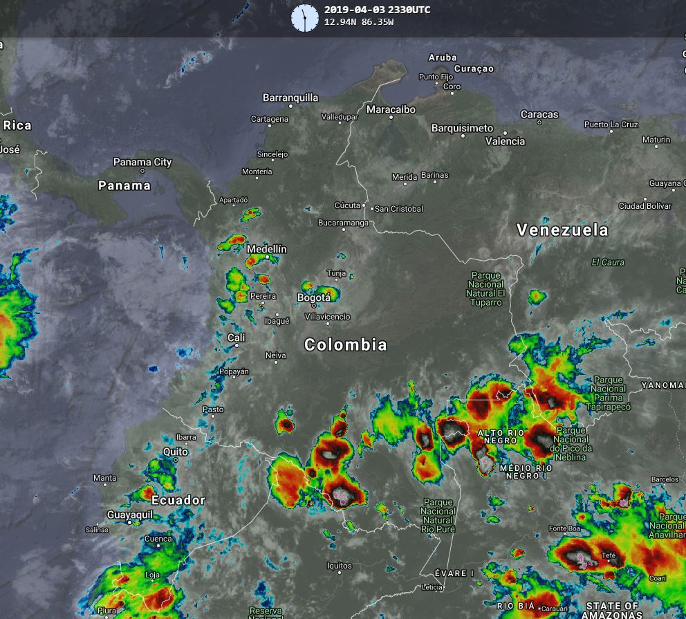 Condiciones inestables, humedad y precipitaciones fuertes, algunas acompañadas de actividad eléctrica, en sectores de los departamentos de Chocó, Antioquia, Eje Cafetero, Putumayo, Amazonas, Caquetá, Vaupés, Guaviare y Guainía. Precipitaciones de menor intensidad en sectores de Valle del Cauca, Cauca, Nariño, Boyacá y Cundinamarca.