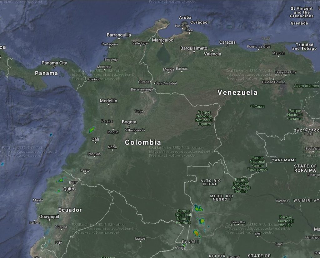 Condiciones inestables en algunos sectores debido a la interacción de la Zona de Confluencia intertropical con una Vaguada al occidente del país. Lluvias ligeras a moderadas y tormentas aisladas en los departamentos de Chocó, Valle del Cauca, Cauca, Nariño, precipitaciones ocasionales y lluvias sectorizadas en Antioquia, Tolima y Eje Cafetero. El ingreso de humedad por el sur del país genera lluvias en Amazonas, Guainía y Vaupés. Condiciones de tiempo seco en la región Caribe y Orinoquia debido a corrientes en chorro en superficie.