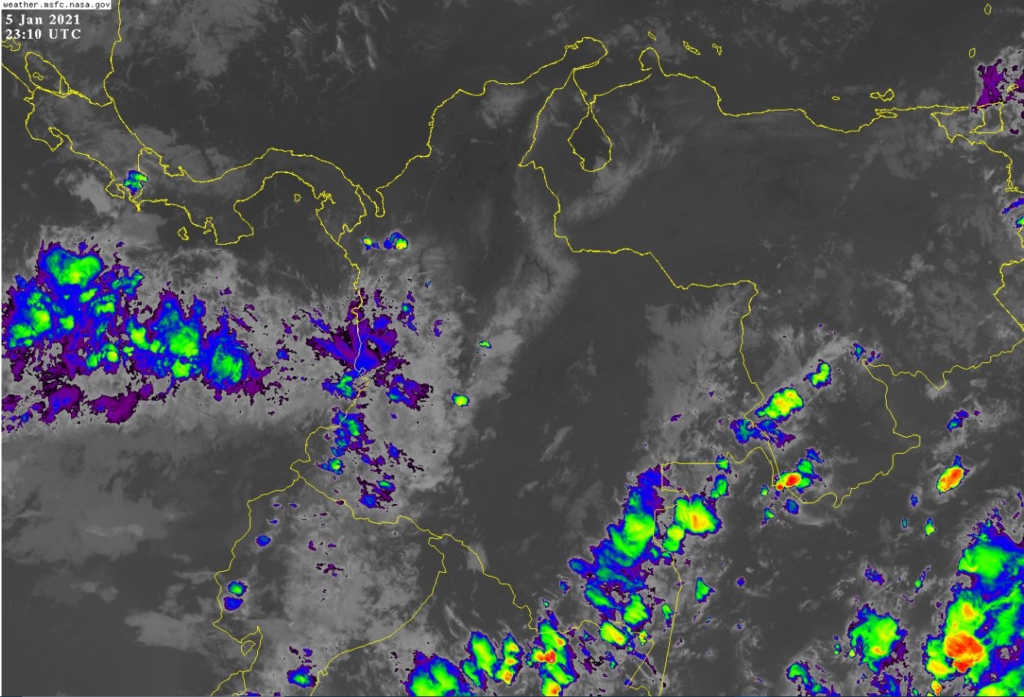 La interacción de la Zona de Confluencia Intertropical con una vaguada en el Pacifico, genera inestabilidad atmosférica ocasionando precipitaciones ocasionales y lluvias sectorizadas, en los departamentos de Antioquia, Chocó, Valle, Cauca y Nariño. El ingreso de humedad por el sur y oriente del país favorece el incremento de nubosidad ocasionando lluvias sectorizadas a ligeras y tormentas aisladas en Amazonas, Vaupés, Guainía y Caquetá. Procesos convectivos locales favorecen precipitaciones ocasionales y lluvias sectorizadas a ligeras en Cundinamarca, Boyacá, Huila, Eje Cafetero y Tolima. Se encuentra activo corriente en chorro en superficie sobre la Orinoquia, favoreciendo condiciones de tiempo seco en los departamentos de Arauca, Casanare, Vichada y Meta.