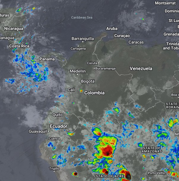 El ramal Pacífico de la Zona de Confluencia Intertropical en interacción con una Vaguada, un Sistema de Baja Presión, el ingreso de humedad por el Suroriente del país y procesos convectivos locales, favorecen condiciones inestables que generan lluvias ligeras a moderadas y algunas tormentas en sectores de los departamentos de Antioquia, Chocó, Cauca, Nariño, Putumayo, Caquetá, Huila, Tolima, Cundinamarca, Boyacá, y Los Santanderes. Precipitaciones ocasionales y lluvias de menor intensidad en los departamentos de La Guajira, Magdalena, Bolívar y Amazonas.