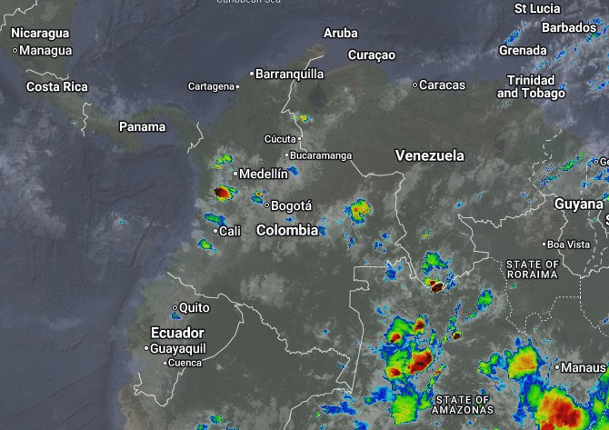 El ramal Pacífico de la Zona de Confluencia Intertropical en interacción con una Vaguada, un Sistema de Baja Presión, así como procesos convectivos locales favorecen condiciones inestables, que generan lluvias a ligeras a moderadas y algunas tormentas en sectores de los departamentos de Choco, Valle de Cauca, Cauca, Nariño, Huila, Santander, Tolima, Córdoba, Guaviare, Boyacá, Amazonas y Guainía. Precipitaciones ocasionales y lluvias de menor intensidad en los departamentos de Antioquia, Atlántico, Bolívar, Caldas, Caquetá, Casanare, Cesar, Cundinamarca, La Guajira, Magdalena, Meta, Norte de Santander, Putumayo, Quindío, Risaralda, Sucre, Arauca, Vaupés y Vichada.