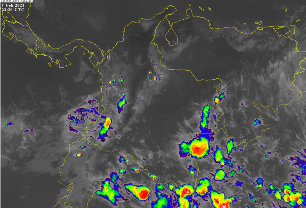 El ramal pacifico de la Zona de Confluencia Intertropical (ZCIT) en interacción con una Vaguada en el Pacífico, favorece condiciones inestables aumentando la nubosidad y generando lluvias de variada intensidad principalmente en Nariño, lloviznas ligeras en Cauca, Valle del Cauca y Chocó. El ingreso de humedad por el suroriente del territorio nacional favorece la presencia de lluvias ligeras a moderadas en Amazonas, Vaupés y Guainía. Se encuentran activas corrientes en chorro en superficie en el mar Caribe y la Orinoquia, con vientos entre 20 y 30 nudos (37 a 55 km/h), que favorece condiciones de tiempo seco en la costa norte y llanos orientales.