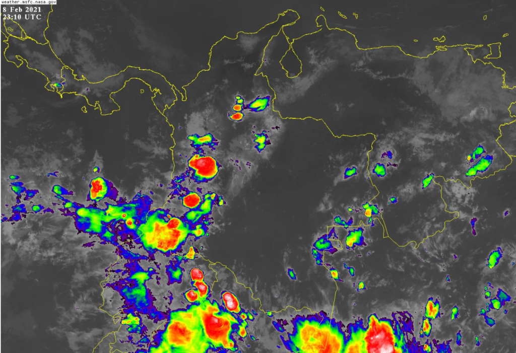 El ramal pacifico de la Zona de Confluencia Intertropical (ZCIT) en interacción con una Vaguada en el Pacífico, favorece condiciones inestables aumentando la nubosidad, generando lluvias de variada intensidad en Nariño y Cauca. Procesos convectivos locales generan lluvias ligeras a moderadas y algunas tormentas aisladas en Santander, Boyacá, Antioquia, Eje Cafetero y Tolima. El ingreso de humedad por el suroriente del territorio nacional favorece la presencia de lluvias ligeras en Amazonas, Vaupés y Guainía. Se encuentran activas corrientes en chorro en superficie en el mar Caribe y la Orinoquia, con vientos entre 20 y 30 nudos (37 a 55 km/h), favoreciendo condiciones de tiempo seco en la costa norte y llanos orientales.