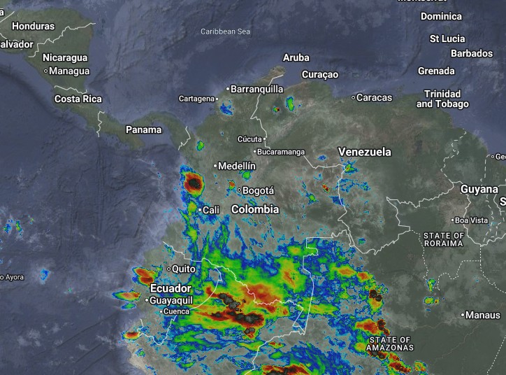 El ramal Pacífico de la Zona de Confluencia Intertropical en interacción con una Vaguada, un Sistema de Baja Presión, JET (viento en chorro de nivel bajo), así como procesos convectivos locales favorecen condiciones inestables, que generan lluvias de ligeras a fuertes y algunas tormentas en sectores de los departamentos de Córdoba, Antioquia, Chocó, Valle del Cauca, Cauca, Nariño, Eje Cafetero, Santander, Boyacá, Cundinamarca, Tolima, Caquetá, Guaviare y Amazonas. Precipitaciones ocasionales y lluvias de menor intensidad en los departamentos de La Guajira, Magdalena, Cesar, Norte de Santander, Arauca y Casanare.