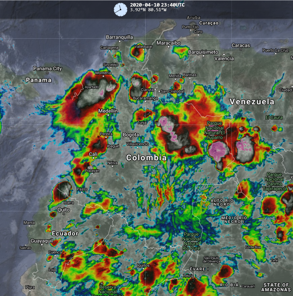 Condiciones inestables en el occidente del país debido a la interacción de la zona de confluencia intertropical con una vaguada generando lluvias fuertes y tormentas en Nariño, Cauca, Valle, Chocó, Antioquia, Eje Cafetero, Córdoba, Norte de Santander, Santander, Boyacá y Cundinamarca. El ingreso de humedad por el sur y oriente del país favorece lluvias de variada intensidad, algunas acompañadas de actividad eléctrica, en sectores de los departamentos de Vichada, Meta, Casanare y Arauca. Lluvias ligeras en Guainia, Vaupes, Guaviare, Caquetá, Putumayo, Huila y Tolima.