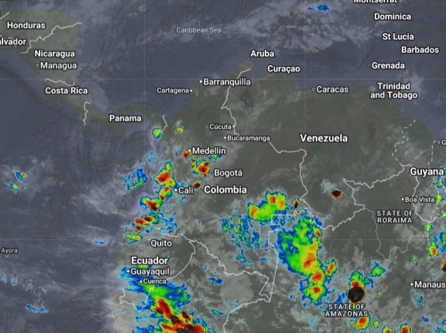El ramal Pacífico de la Zona de Confluencia Intertropical en interacción con una Vaguada, un Sistema de Baja Presión, JET (viento en chorro de nivel bajo), así como procesos convectivos locales favorecen condiciones inestables, que generan lluvias de ligeras a fuertes y algunas tormentas en sectores de los departamentos de Antioquia, Tolima y Choco. Precipitaciones ocasionales y lluvias de menor intensidad en los departamentos de Amazonas, Arauca, Atlántico, Bolívar, Boyacá, Caldas, Caquetá, Casanare, Cauca, Cesar, Córdoba, Cundinamarca, Guainía, Guaviare, Huila, La Guajira, Magdalena, Meta, Nariño, Norte de Santander, Putumayo, Quindío, Risaralda, Santander, Sucre, Valle del Cauca, Vaupés y Vichada