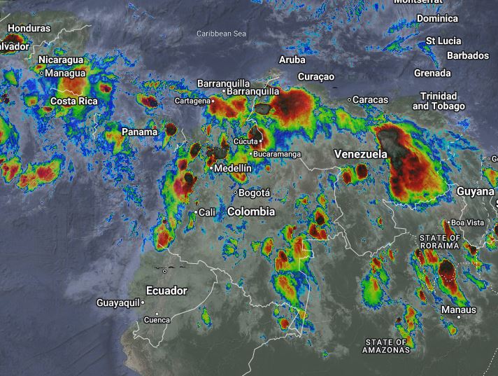 El ramal Pacífico de la Zona de Confluencia Intertropical en interacción con una Vaguada, un Sistema de Baja Presión, el ingreso de humedad por el Oriente del país, así como procesos convectivos locales favorecen condiciones inestables, que generan lluvias ligeras a fuertes y algunas tormentas en sectores de los departamentos de Cesar, Magdalena, Bolívar, Sucre, Córdoba, Antioquia, Santanderes, Boyacá, Chocó, Valle del Cauca, Cauca, Nariño, Putumayo, Caquetá, Vaupés, Guaviare, Guainía, Vichada, Casanare y Arauca. Precipitaciones ocasionales y lluvias de menor intensidad en los departamentos de Cundinamarca, Eje Cafetero, Tolima, Huila, Meta y Amazonas.