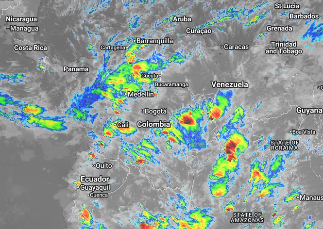 El ramal Pacífico de la Zona de Confluencia Intertropical en interacción con una Vaguada, un Sistema de Baja Presión, así como procesos convectivos locales favorecen condiciones inestables, que generan lluvias de ligeras a moderadas y algunas tormentas en sectores de los departamentos de Tolima, Boyacá, Nariño, Cauca, Huila, Meta, Vichada, Sucre, Bolívar y Antioquia. Precipitaciones ocasionales y lluvias de menor intensidad en los departamentos de Amazonas, Arauca, Atlántico, Caquetá, Casanare, Cesar, Chocó, Córdoba, Cundinamarca, Guainía, Guaviare, La Guajira, Magdalena, Norte de Santander, Putumayo, Quindío, Risaralda, Santander, Valle del Cauca y Vaupés.