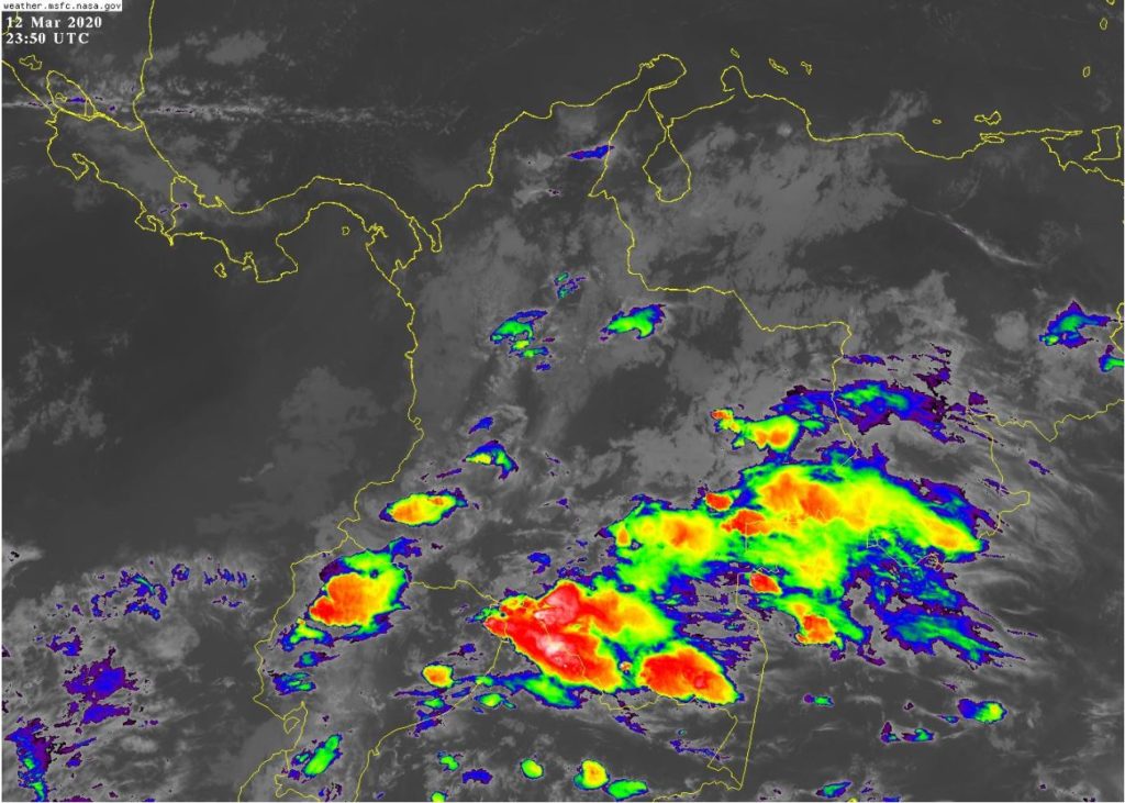 El ingreso de humedad por el sur del país genera inestabilidad atmosférica produciendo lluvias moderadas a fuertes, algunas acompañadas de actividad eléctrica, en sectores de los departamentos de Nariño, Cauca, Putumayo, Guainía, Vaupés, Guaviare, Amazonas y Caquetá. Lluvias de menor intensidad en sectores de Valle, Eje cafetero, Antioquia, Cundinamarca, Boyacá y Santander. Vientos fuertes en la zona marítima de la costa caribe con intensidades de entre 25 y 30 nudos (46 a 55 Km/h), debido a corriente en chorro.