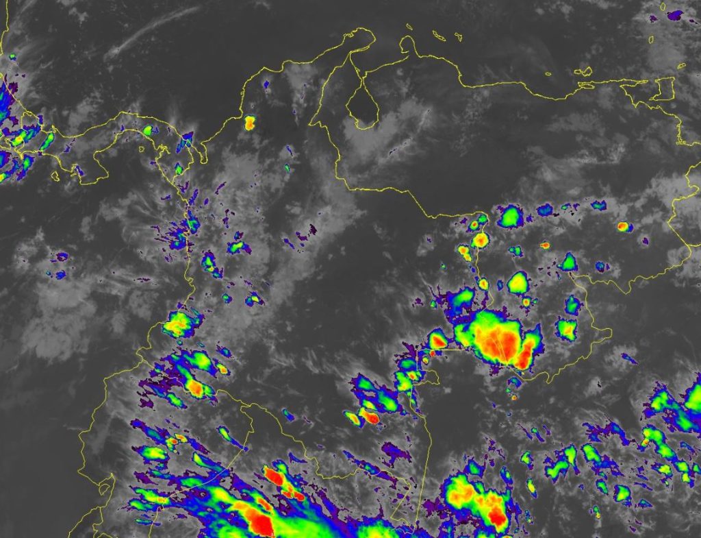 Para esta noche se prevén lluvias de variada intensidad y algunas tormentas acompañadas de actividad eléctrica en el sur y occidente del país, especialmente en sectores de los departamentos de Guainía, Guaviare, Vaupés, Amazonas, Nariño, Cauca, Valle del Cauca, Chocó, Antioquia, Caldas, Risaralda, Quindío, Tolima, Cundinamarca, Santander y Boyacá. Precipitaciones ocasionales y Lluvias de menor intensidad en Cesar, Bolívar, Sucre, Córdoba, Huila, Caquetá, Putumayo y Vichada