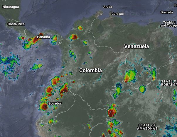 Para esta noche se presenta cielo entre parcial y mayormente nublado en gran parte del territorio nacional, debido a la interacción de la Zona de Confluencia Intertropical y una vaguada en el Pacifico, generando inestabilidad atmosférica, por lo que se prevén lluvias de variada intensidad y algunas tormentas en sectores de los departamentos de Córdoba, Sucre, Bolívar, Magdalena, Cesar, Norte de Santander, Santander, Antioquia, Chocó, Valle del Cauca, Cauca, Nariño, Caquetá y Putumayo. Precipitaciones ocasionales y lluvias de menor intensidad en Boyacá, Cundinamarca, Eje Cafetero, Huila, Tolima, Guainía, Vaupés y Amazonas.