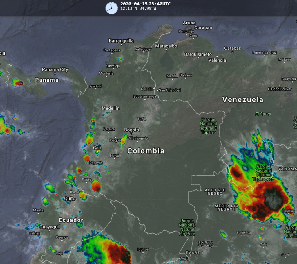 Condiciones de cielo parcialmente nublado y tiempo seco en gran parte del territorio nacional. Debido a la interacción de la zona de confluencia intertropical con una vaguada en el occidente del país podrían presentarse algunas lluvias fuertes en Nariño, Cauca, Valle y Chocó. El ingreso de humedad por el oriente del país favorece la presencia de algunas lluvias ligeras en sectores de los departamentos de Vichada, Vaupés y Guainía.