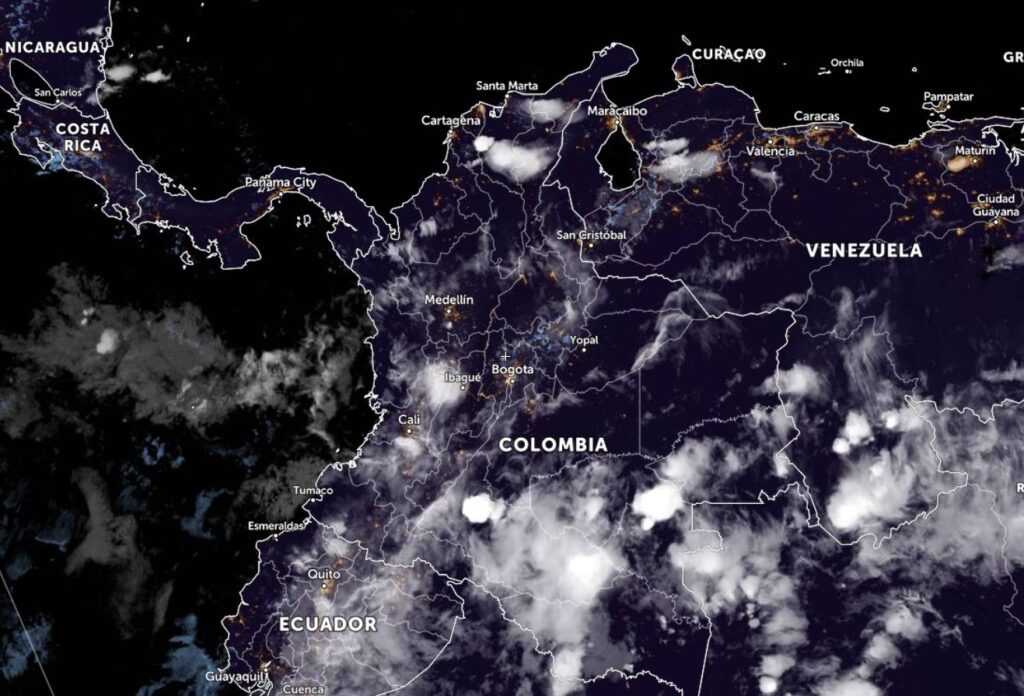 La Zona de Confluencia Intertropical y un sistema de baja presión, incrementan la nubosidad generando lluvias de variada intensidad en sectores de los departamentos de Antioquia, Chocó, Valle del Cauca, Cauca y Nariño. El ingreso de humedad desde el suroriente del país genera lluvias de menor intensidad en Amazonas, Putumayo, Caquetá, Vaupés, Guaviare y Guainía. Procesos convectivos locales favorecen precipitaciones ocasionales y lluvias aisladas en Córdoba, Sucre, Bolívar, Magdalena, Cesar, Boyacá, Cundinamarca, Huila, Tolima, Eje Cafetero y Santanderes. Una corriente en chorro en superficie sobre el mar caribe favorece condiciones de tiempo seco, incremento la velocidad del viento con intensidades entre 20 y 25 nudos (35 a 45 km/h).