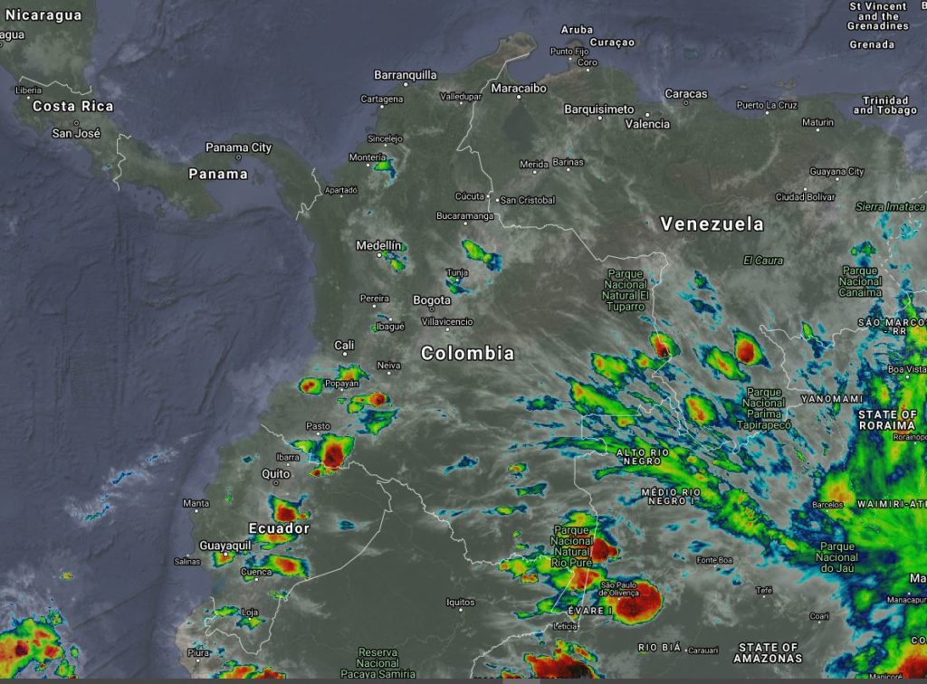El ingreso de humedad por el sur y oriente del país genera inestabilidad atmosférica, produciendo lluvias moderadas a fuertes, algunas acompañadas de actividad eléctrica, en sectores de los departamentos de Chocó, Valle del Cauca, Eje Cafetero, Huila, Tolima, Boyacá y Santander. Lluvias ligeras a moderadas en sectores de Córdoba, Norte de Santander, Cundinamarca, Cauca, Nariño, Putumayo, Amazonas Vaupés y Guainia. Vientos fuertes en la zona marítima de la costa Caribe con intensidades entre 25 y 38 nudos (45 a 68 Km/h), debido a corriente en chorro.