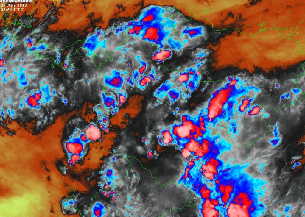Condiciones inestables, humedad y precipitaciones fuertes, algunas acompañadas de actividad eléctrica, en sectores de los departamentos de La Guajira, Cesar, Magdalena, Atlántico, Bolívar, Antioquia, Norte de Santander, Santander, Valle del Cauca, Cauca Nariño, Cundinamarca, Boyacá, Caldas, Risaralda, Quindío, Amazonas, Caquetá, Vaupés, Guainía, Guaviare, Casanare, Arauca y Vichada. Precipitaciones de menor intensidad en sectores de Sucre, Córdoba, Putumayo, Chocó, Huila, Tolima y Meta.
