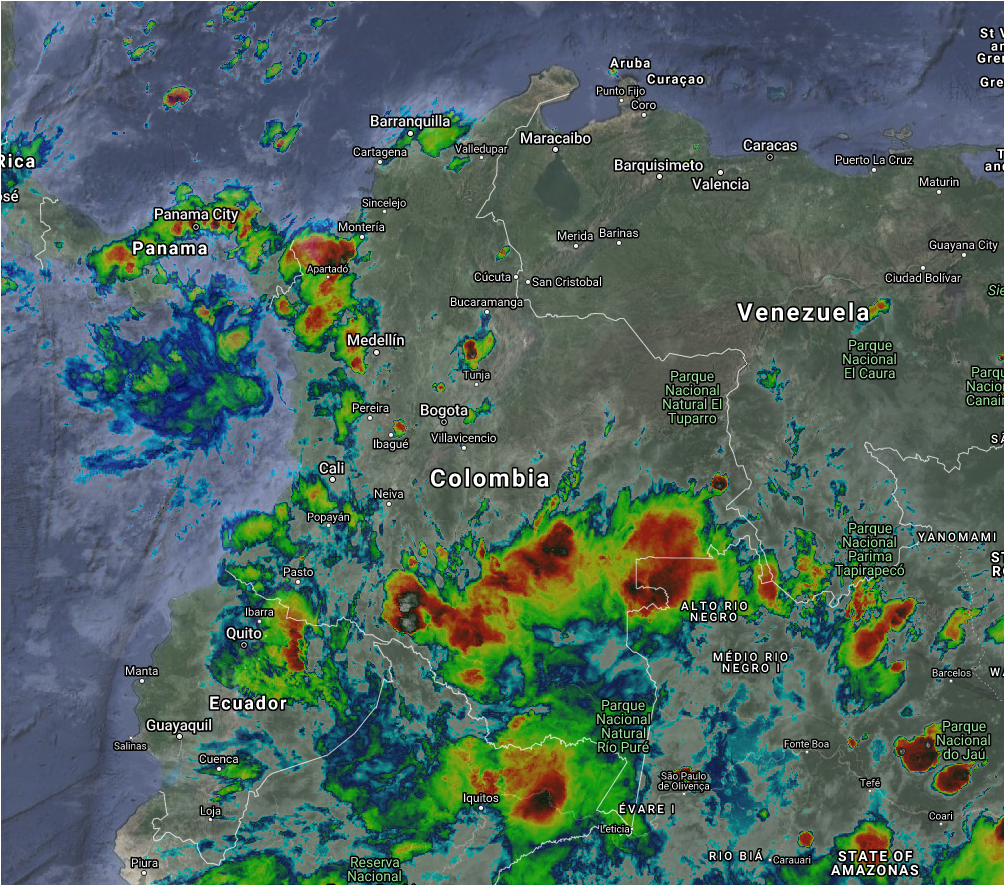 El ingreso de humedad genera lluvias moderadas a fuertes y tormentas en el oriente y suroriente del país, especialmente en sectores de los departamentos de Guainía, Guaviare, Meta, Vaupés, Amazonas, Caquetá, Putumayo, Nariño, Cauca y Valle del Cauca. Procesos convectivos locales generan lluvias y tormentas aisladas en Chocó, Antioquia, Eje Cafetero, Tolima, Cundinamarca, Boyacá, Santander, Norte de Santander y Córdoba.