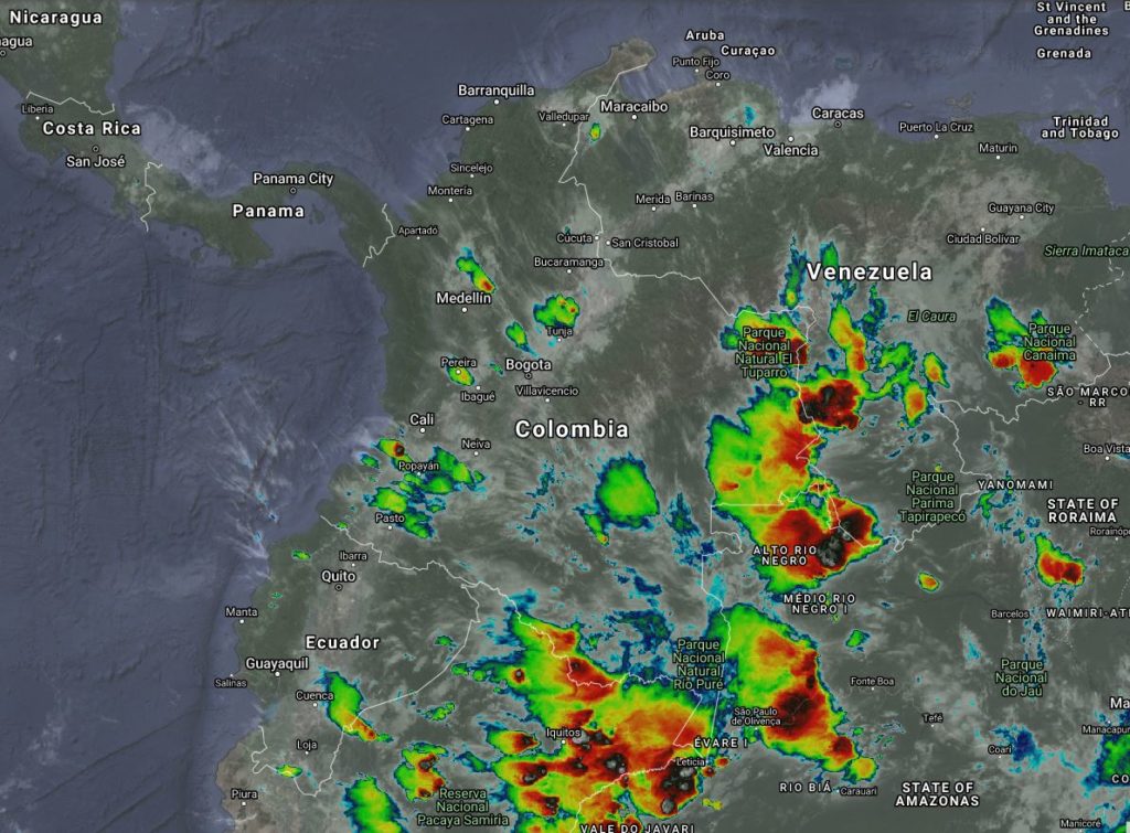Para esta noche la imagen satelital nos muestra cielo entre parcial y mayormente nublado en gran parte del territorio nacional, se prevén condiciones de tiempo seco en la región Caribe y de la Orinoquia, lluvias ligeras a fuertes en sectores de los departamentos de Norte de Santander, Arauca, Boyacá, Cundinamarca, Cauca, Nariño, Guainía, Vaupés, y Amazonas. Precipitaciones ocasionales y lluvias sectorizadas en Santander, Antioquia, Chocó, Valle del Cauca, Eje cafetero, Tolima, Huila, Putumayo, Caquetá, Guaviare y Vichada.