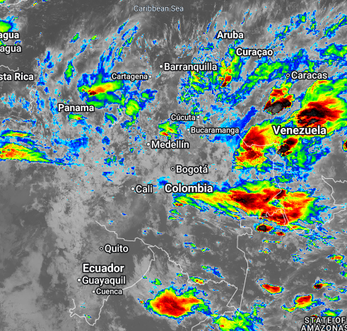 El ramal Pacífico de la Zona de Confluencia Intertropical en interacción con una Vaguada, un Sistema de Baja Presión, así como procesos convectivos locales favorecen condiciones inestables, que generan lluvias ligeras a moderadas y algunas tormentas en sectores de los departamentos de Meta, Guainía y Amazonas, Antioquia, Santander, Boyacá, Cundinamarca, Eje Cafetero, Chocó, Valle del Cauca, Cauca, Nariño, Putumayo, Caquetá, Guaviare, Precipitaciones ocasionales y lluvias de menor intensidad en los departamentos de Cesar, Guajira, Magdalena, Bolívar, Sucre, Córdoba, Norte de Santander, Arauca, Casanare, Tolima, Huila y Vaupés.