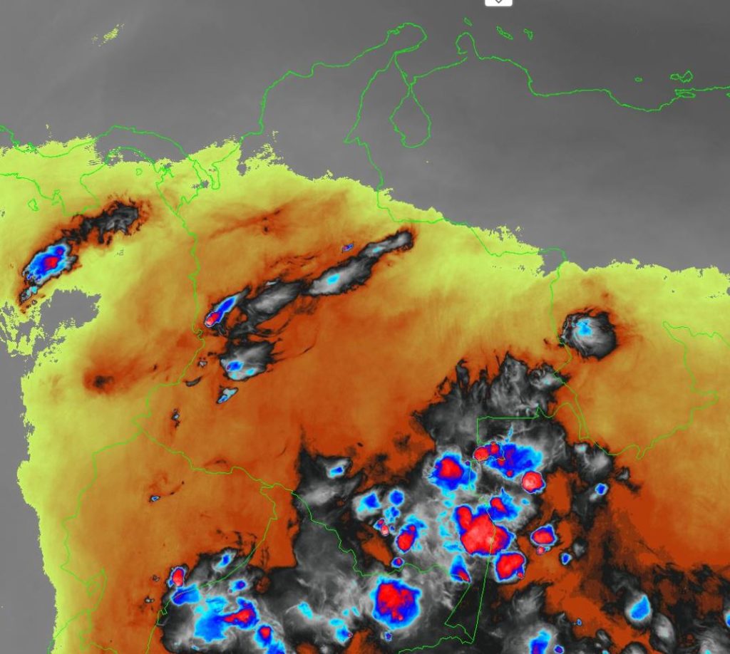 Se mantienen condiciones de tiempo seco en el centro y norte del país, inestabilidad atmosférica el occidente y suroriente, lluvias de moderadas a fuertes y tormentas en sectores de los departamentos de Chocó, Valle del Cauca, Nariño, Caquetá, Amazonas, Vaupés y Guainía. Precipitaciones de menor intensidad en Antioquia, Tolima, Cundinamarca, Boyacá y Santander.