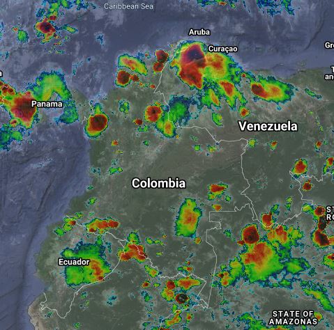 Condiciones de cielo nublado en el Nororiente, Norte y noroccidente del país. Lluvias moderadas a fuertes y algunas en sectores de La Guajira, Cesar, Magdalena, Bolívar, Córdoba, Chocó, Antioquia, Norte de Santander, Santander y Boyacá. Lluvias y algunas tormentas aisladas en Cundinamarca, Tolima, Eje Cafetero, Valle del Cauca, Cauca, Nariño, Putumayo, Caquetá, Amazonas, Vaupés y Guainía.