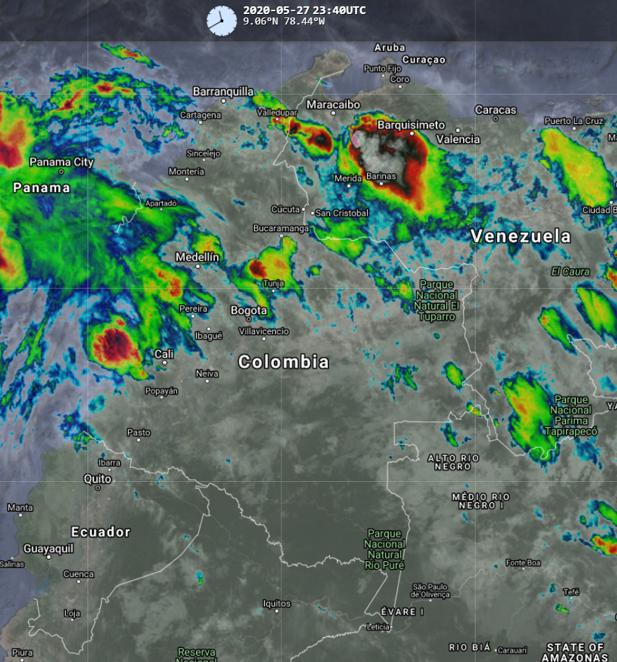 La interacción de la Zona de Confluencia Intertropical con una vaguada en el pacífico, así como el ingreso de una Onda Tropical del Este, generan condiciones inestables en sectores de las regiones Pacífica, Caribe y Andina. Para esta noche se prevén lluvias de variada intensidad y tormentas en sectores de los departamentos de Cesar, Magdalena, Bolívar, Sucre, Córdoba, Antioquia, Chocó, Valle del Cauca, Cauca, Nariño, Santanderes, Cundinamarca y Boyacá. Precipitaciones ocasionales y lluvias de menor intensidad en Casanare, Vichada, Meta y Arauca.