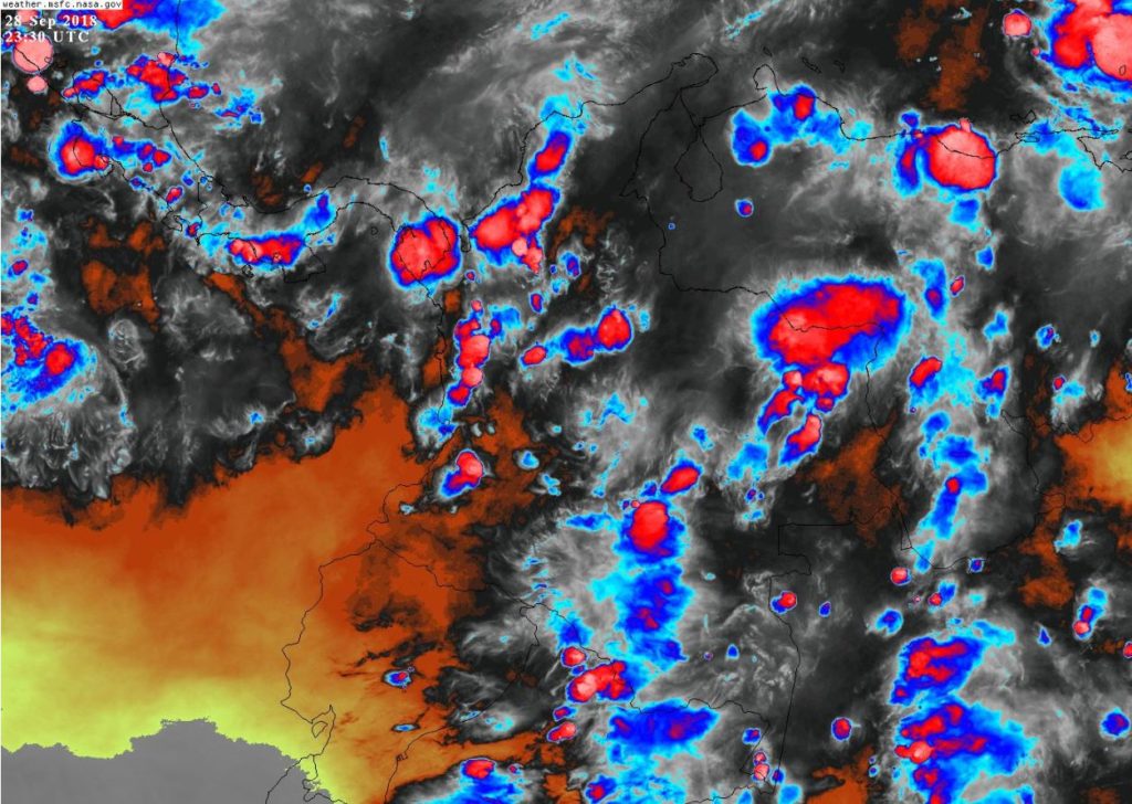 Condiciones inestables, humedad y precipitaciones de moderadas a fuertes, algunas acompañadas de actividad eléctrica, en sectores de los departamentos de Antioquia, Córdoba, Chocó, Valle del Cauca, Cauca, Guaviare, Vichada, Boyacá, Santander y Caldas. Precipitaciones de menor intensidad en sectores de La Guajira, Magdalena, Atlántico, Bolívar, Sucre, Caquetá, Putumayo, Amazonas, Vaupés, Meta, Guainía, Casanare, Arauca, Cundinamarca y Tolima.