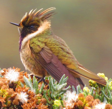 Buffy Helmetcrest (Oxypogon stubelii). Endémico de Colombia, ubicado en la cordillera central, páramos aledaños al Parque los Nevados. Foto: Oswaldo Cortés