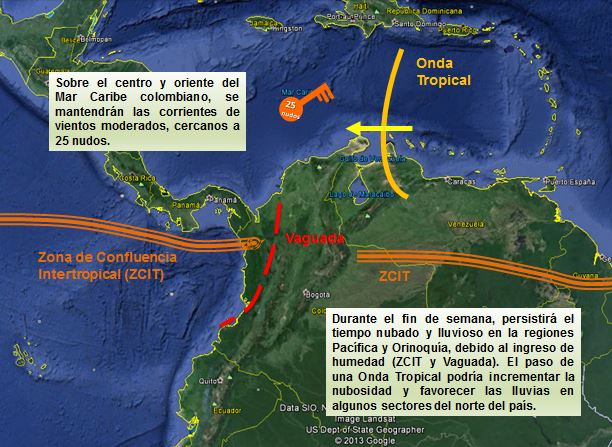 Para este fin de semana, persistirá el tiempo nublado y lluvioso en las regiones Pacífica y Orinoquía, aunque es probable el incremento de nubosidad y la presencia de lluvias sectorizadas en el norte del país, debido al paso de una Onda tropical por el territorio nacional. Las madrugadas y mañanas serán nubladas y lluviosas en Chocó y la zona litoral de Valle y Cauca. Lluvias de menor intensidad en Norte de Santander, Arauca, Vichada, así como en Cesar y Magdalena. En la tarde y especialmente hacia la noche, se espera incremento de la nubosidad y lluvias dispersas de variada intensidad, sobre Chocó, así como en algunos sectores de Valle, Cauca, el Eje Cafetero, Santander, Norte de Santander. El sur de la región Caribe, no será la excepción, algunas lluvias son posibles, en el sur de Cesar, Magdalena, Bolívar y Córdoba. En los Llanos Orientales las lluvias más fuertes se prevé en Arauca, Vichada y Meta. No se descartan algunas lluvias en la isla de San Andrés y Providencia. En áreas del centro y oriente del mar Caribe colombiano, se mantienen las corrientes de vientos moderados.