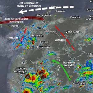 El ramal Pacífico de la Zona de Confluencia Intertropical en interacción con una Vaguada, un Sistema de Baja Presión, así como procesos convectivos locales favorecen condiciones inestables, que generan lluvias a ligeras a moderadas y algunas tormentas en sectores de los departamentos de Choco, V...