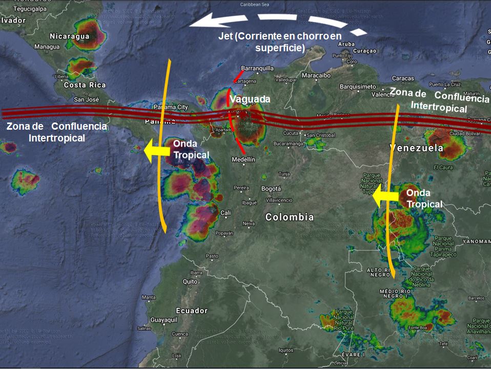El desplazamiento de La Zona de Confluencia Intertropical y su interacción con una vaguada, sumado al paso de Ondas Tropicales del Este, genera inestabilidad atmosférica en gran parte de la regiones Caribe, Pacifica y en la Orinoquia. Vientos fuertes en la zona marítima del norte de Colombia, con intensidades superiores a los 25 nudos (50 Km/h), originados por una corriente en chorro en superficie.