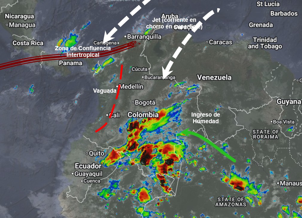 El ramal Pacífico de la Zona de Confluencia Intertropical en interacción con una Vaguada, un Sistema de Baja Presión, así como procesos convectivos locales favorecen condiciones inestables, que generan lluvias ligeras a moderadas y algunas tormentas en sectores de los departamentos de Antioquia, Amazonas, Atlántico, Bolívar, Boyacá, Caldas, Caquetá, Casanare, Cauca, Cesar, Chocó, Córdoba, Cundinamarca, Guainía, Guaviare, Huila, La Guajira, Magdalena, Meta, Nariño, Norte de Santander, Putumayo, Quindío, Risaralda, Santander, Sucre, Tolima, Valle del Cauca, Vaupés y Vichada. Precipitaciones ocasionales y lluvias de menor intensidad en los departamentos de Arauca