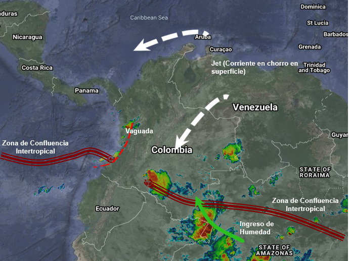 La interacción de La Zona de Confluencia Intertropical con una Vaguada en niveles bajos genera inestabilidad atmosférica en el occidente y suroccidente del país, especialmente en sectores de los departamentos de Antioquia; Chocó, Eje Cafetero, Valle del Cauca, Cauca y Nariño. El ingreso de humedad favorece lluvias de variada intensidad en Amazonas, Caquetá, Vaupés y Guainía. Procesos convectivos locales generan algunas precipitaciones ocasionales en Cundinamarca, Boyacá y Los Santanderes. Condiciones de tiempo seco y soleado en la región Caribe y Orinoquia debido a corrientes en Chorro en Superficie.