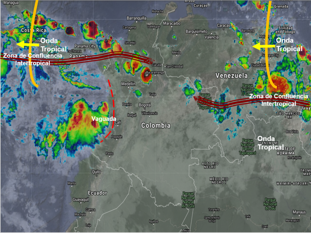 El ramal pacifico de la Zona de Confluencia Intertropical en interacción con una vaguada y el paso de Ondas Tropicales del Este, generan nubosidad convectiva que favorece la presencia de lluvias de variada intensidad en las regiones Pacífica, Andina y Caribe, afectando especialmente en horas de la tarde sectores de los departamentos de Nariño, Cauca, Valle, Chocó, Antioquia, Santander, Boyacá, Cundinamarca, Eje Cafetero, Tolima, Huila, Córdoba, Sucre, Bolívar, Magdalena y Cesar; lluvias de menor intensidad en el Piedemonte Llanero, Meta, Casanare, Arauca, Vichada, Meta y Guaviare.