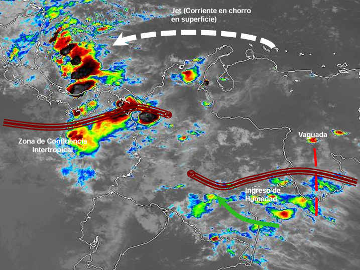 El ramal Pacífico de la Zona de Confluencia Intertropical en interacción con una Vaguada, el ingreso de humedad por el Suroriente del país y procesos convectivos locales favorecen condiciones inestables que generan lluvias ligeras a moderadas y algunas tormentas en sectores de los departamentos de La Guajira, Magdalena, Atlántico, Antioquia, Chocó, Valle del Cauca, Cauca, Nariño, Eje Cafetero, Putumayo, Caquetá, Meta, Vichada y Guaviare. Precipitaciones ocasionales y lluvias de menor intensidad en los departamentos de Magdalena. Sucre, Córdoba, Los Santanderes, Boyacá, Cundinamarca, Tolima, Huila, Vaupés y Amazonas
