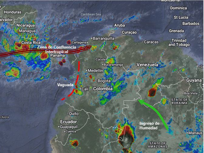 El ramal Pacífico de la Zona de Confluencia Intertropical en interacción con una Vaguada, un Sistema de Baja Presión, así como procesos convectivos locales favorecen condiciones inestables, que generan lluvias ligeras a moderadas y algunas tormentas en sectores de los departamentos de Cesar, Magdalena, Bolívar, Sucre, Córdoba, Antioquia, Santanderes, Boyacá, Cundinamarca, Eje Cafetero, Chocó, Valle del Cauca, Cauca, Nariño, Putumayo, Caquetá, Huila y Tolima. Precipitaciones ocasionales y lluvias de menor intensidad en los departamentos de Guajira, Atlántico, Arauca, Casanare, Meta, Vichada, Guainía, Guaviare, Vaupés y Amazonas.