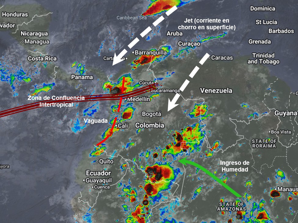 El ramal Pacífico de la Zona de Confluencia Intertropical en interacción con una Vaguada, un Sistema de Baja Presión, así como procesos convectivos locales favorecen condiciones inestables, que generan lluvias ligeras a moderadas y algunas tormentas en sectores de los departamentos de Antioquia, Amazonas, Atlántico, Bolívar, Boyacá, Caldas, Caquetá, Casanare, Cauca, Cesar, Chocó, Córdoba, Cundinamarca, Guainía, Guaviare, Huila, La Guajira, Magdalena, Meta, Nariño, Norte de Santander, Putumayo, Quindío, Risaralda, Santander, Sucre, Tolima, Valle del Cauca, Arauca, Vaupés y Vichada.