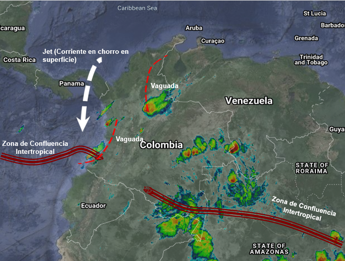La interacción de La Zona de Confluencia Intertropical con una Vaguada en niveles bajos continúa generando lluvias moderadas a fuertes y algunas tormentas aisladas en los departamentos del occidente y suroccidente del país, especialmente en sectores de Antioquia, Chocó, Eje Cafetero, Valle del Cauca, Cauca y Nariño. Precipitaciones de menor intensidad en Huila, Tolima y Cundinamarca. Una Vaguada en el Nororiente favorece lluvias y tormentas aisladas en Boyacá y Santander. El ramal Atlántico de la Zona de Confluencia Intertropical genera durante toda la jornada lluvias de variada intensidad en Amazonas, Caquetá, Vaupés, Meta y Guainía.