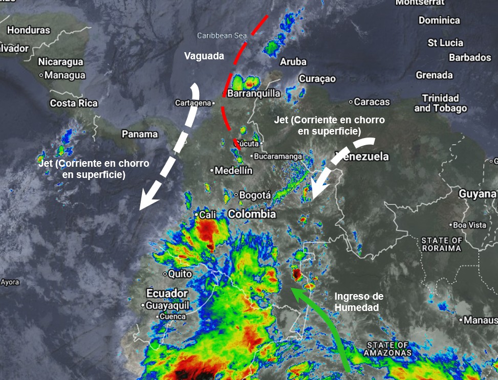 El ramal Pacífico de la Zona de Confluencia Intertropical en Interacción con una vaguada, un Sistema de Baja Presión, el ingreso de humedad desde el Suroriente del país y procesos convectivos locales favorecen condiciones inestables, que generan lluvias ligeras a moderadas y algunas tormentas en sectores de los departamentos de Antioquia, Atlántico, Bolívar, Boyacá, Caldas, Cauca, Cesar, Chocó, Córdoba, Cundinamarca, Guainía, Huila, La Guajira, Magdalena, Nariño, Norte de Santander, Quindío, Risaralda, Santander, Sucre, Tolima y Valle del Cauca. Precipitaciones ocasionales y lluvias de menor intensidad en los departamentos de Arauca, Casanare, Vichada, Meta, Guaviare, Caquetá, Putumayo, Amazonas y Vaupés.