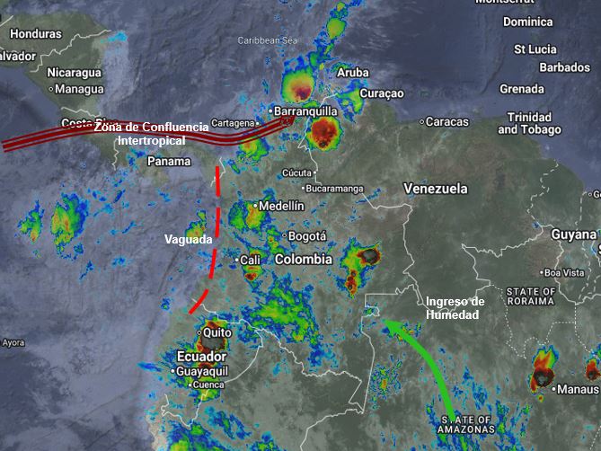 El ramal Pacífico de la Zona de Confluencia Intertropical en Interacción con una vaguada, un Sistema de Baja Presión, el ingreso de humedad desde el Suroriente del país así como procesos convectivos locales favorecen condiciones inestables, que generan lluvias ligeras a moderadas y algunas tormentas en sectores de los departamentos de Guajira, Cesar, Magdalena, Bolívar, Sucre, Córdoba, Antioquia, Chocó, Valle del Cauca, Cauca, Nariño, Putumayo, Caquetá, Cundinamarca, Guaviare, Guainía, Vaupés y Amazonas. Precipitaciones ocasionales y lluvias de menor intensidad en los departamentos de Atlántico, Santanderes, Boyacá, Eje Cafetero, Huila, Tolima, Arauca, Casanare, Meta y Vichada,