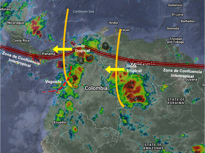 El paso de dos Ondas Tropicales del Este genera inestabilidad atmosférica en gran parte de las regiones Andina, Pacífica, Orinoquia y en el centro y sur de la región Caribe. Lluvias moderadas a fuertes y tormentas en Amazonas, Caquetá, Vaupés, Guainía, Vichada, Arauca, Casanare, Boyacá, Santander, Norte de Santander, Cesar, Magdalena, Atlántico, Bolívar, Sucre, Córdoba, Antioquia, Chocó, Valle del Cauca, Cauca, Eje Cafetero y el Altiplano Cundiboyacense. Precipitaciones de menor intensidad en Nariño, Putumayo, Huila, Tolima, Meta y Guaviare.