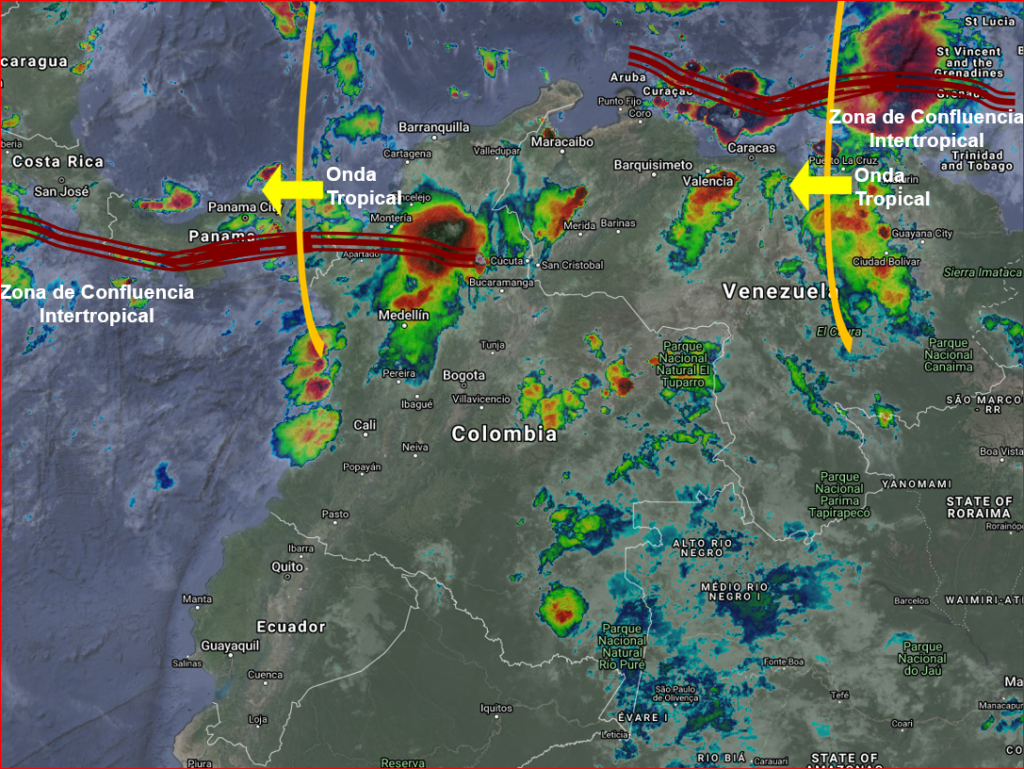 El continuo paso de Ondas Tropicales del Este y el desplazamiento de la Zona de Confluencia Intertropical más hacia el sur, genera condiciones inestables En las regiones Caribe, Andina y el centro y norte de la región Pacífica. Lluvias moderadas a fuertes en sectores de Chocó, Antioquia, Eje Cafetero, Córdoba, sucre, Bolívar, Atlántico, Magdalena, La Guajira, Cesar, Norte de Santander, Santander, Boyacá, Cundinamarca, Tolima, Huila y Caquetá. Precipitaciones de menor intensidad en Arauca, Casanare, Meta, Vichada, Guainía, Guaviare, Vaupés y Amazonas.