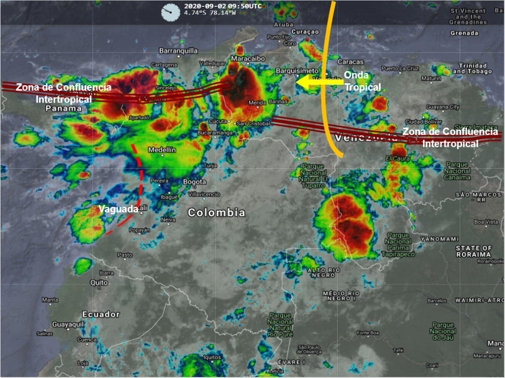La interacción de la Zona de Confluencia Intertropical con un sistema de baja presión, el ingreso de humedad desde el oriente y el continuo paso de Ondas Tropicales del Este, producen inestabilidad atmosférica en gran parte del territorio, generando lluvias moderadas a fuertes, algunas acompañadas de actividad eléctrica, en sectores de los departamentos de Guajira, Magdalena, Cesar, Atlántico, Bolívar, Córdoba, Chocó, Antioquia, Santander, Boyacá, Cundinamarca y Eje Cafetero. Precipitaciones ocasionales y lluvias de menor intensidad en Huila, Putumayo, Tolima, Valle del Cauca, Cauca, Caquetá, Amazonas, Guaviare, Guainía, Vichada, Casanare y Norte de Santander.