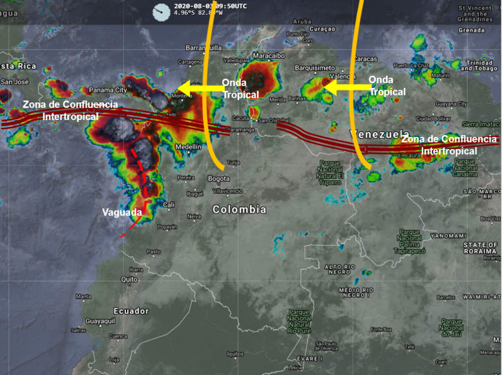 La interacción de la Zona de Confluencia Intertropical con una vaguada en el pacífico, así como el paso de una onda tropical continúan generando inestabilidad atmosférica en las regiones Pacífica y Caribe. Se prevén lluvias de variada intensidad y algunas tormentas, especialmente en horas de la tarde y noche en sectores de los departamentos de La Guajira, Magdalena, Cesar, Bolívar, Córdoba, Sucre, Antioquia, Chocó, Valle del Cauca, Cauca y Nariño. Predominio de tiempo seco en las regiones de la Andina, Orinoquia y Amazonia.